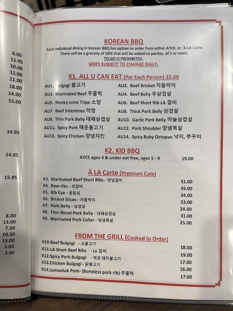 Highlighting traditional Korean BBQ, diners can choose their favorite cuts and grill them to perfection at their own table. The hibachi menu shines with options like shrimp, salmon, and steak.